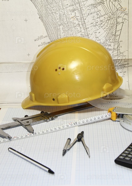 Желтая каска, рулетка и канцелярия на бумаге