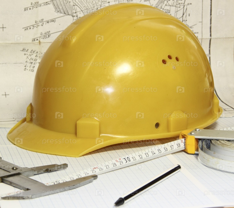 Желтая каска, рулетка и канцелярия на бумаге