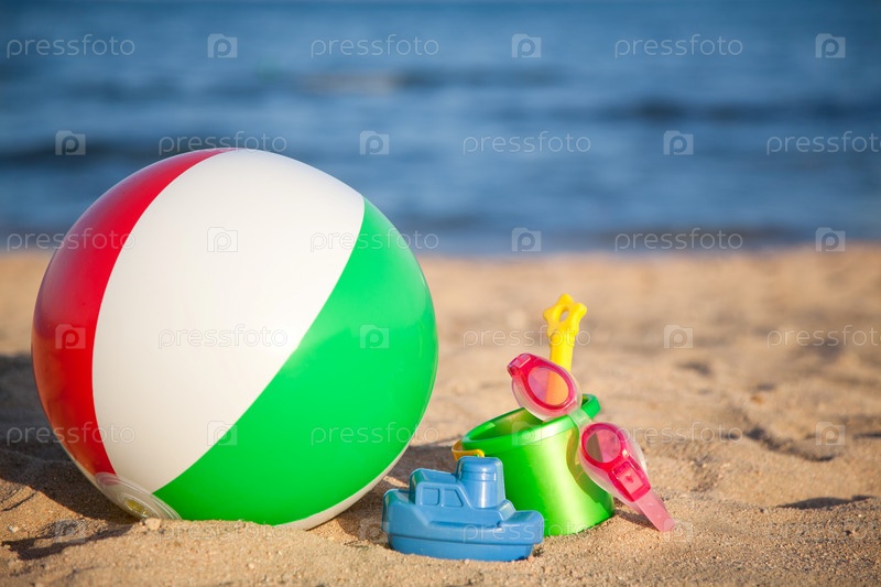 Детские игрушки на пляже. Летние каникулы концепция
