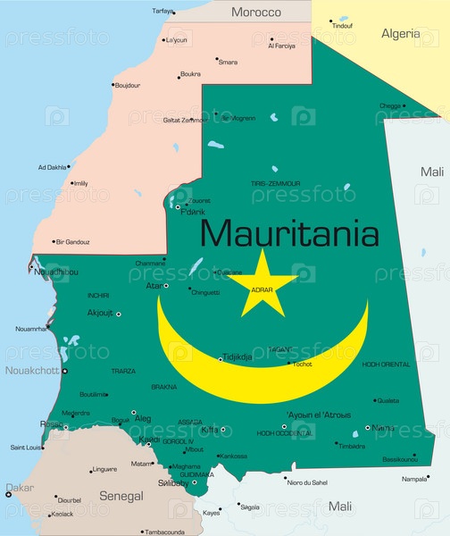 Мавритания на географической карте в цвете национального флага