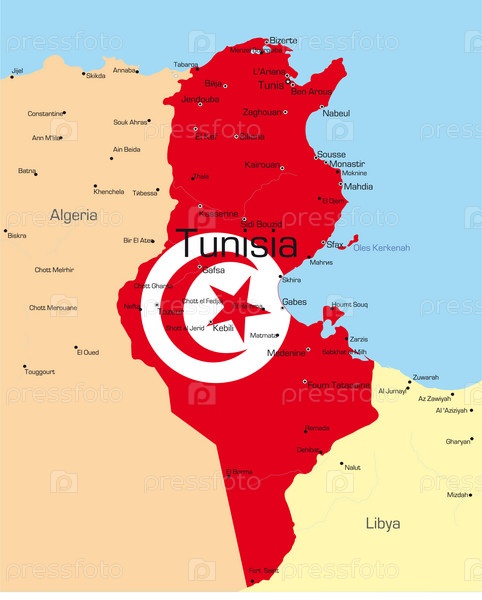 Тунис на географической карте в цвете национального флага