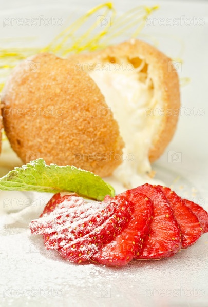 Десерт из мороженого на печенье с клубникой и карамелью