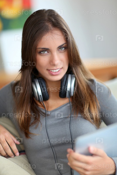 Красивая женщина с сенсорной панелью