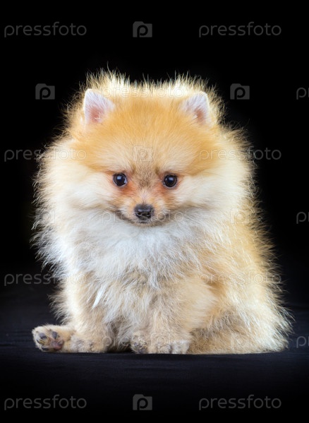 Маленький пушистый щенок померанского шпица на черном фоне