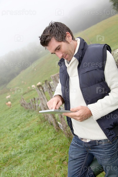 Заводчик, используя планшет в поле