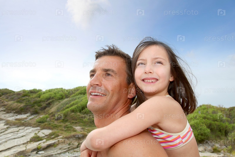 Отец, перевозящих дочь на его плечах