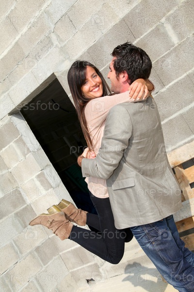 Веселая пара перед домом