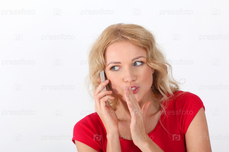 Блондинка в красной рубашке говорит по телефону