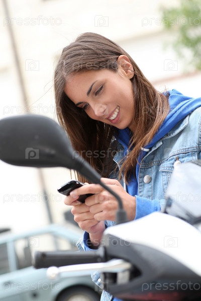 Молодая женщина, сидя на мотоцикле