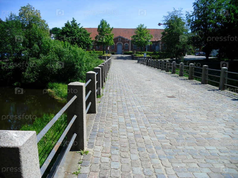 Каменный мост с перилами и дом на фоне неба