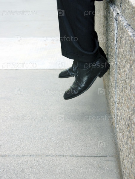 Бизнесмен сидит на выступ с его футов дюймов от земли