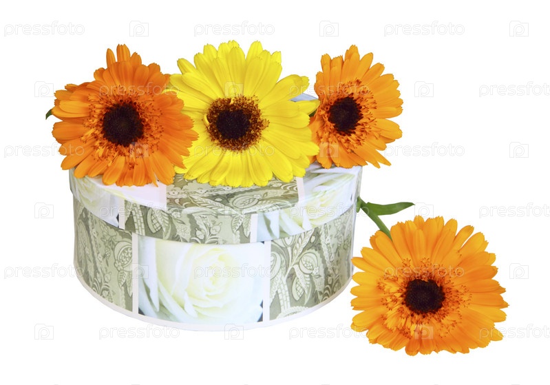 Желтые герберы лежат на подарочной коробке