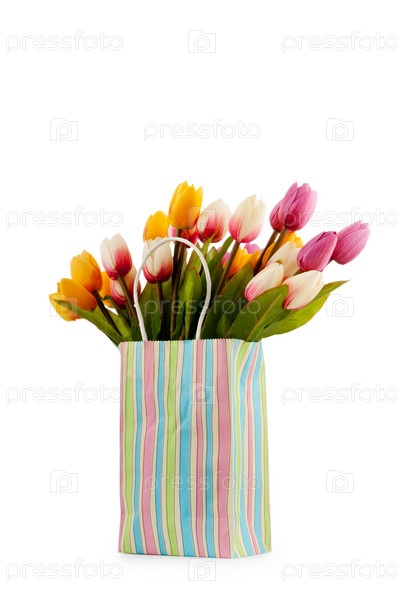 Тюльпаны в полосатом бумажном пакете на белом фоне