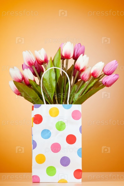 Тюльпаны в пакете на оранжевом фоне