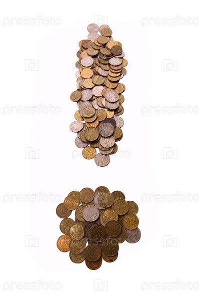 Монеты, выложенные в форме восклицательного знака на белом фоне