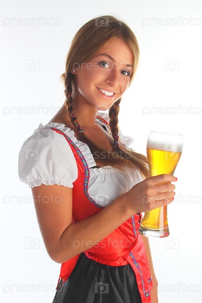 Девушка с бокалом пива на белом фоне