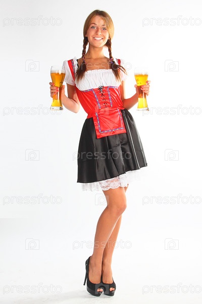 Девушка с бокалами пива на белом фоне