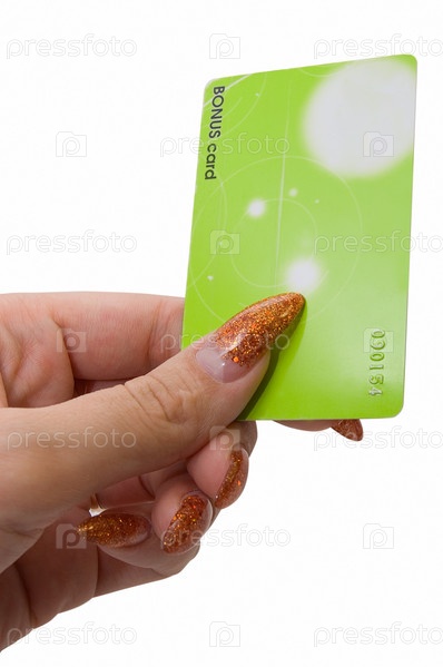Женская рука, держащая бонусную карту на белом фоне