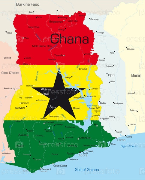 Гана на географической карте в цвете национального флага