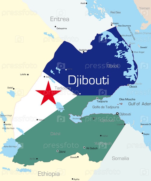 Джибути на географической карте в цвете национального флага