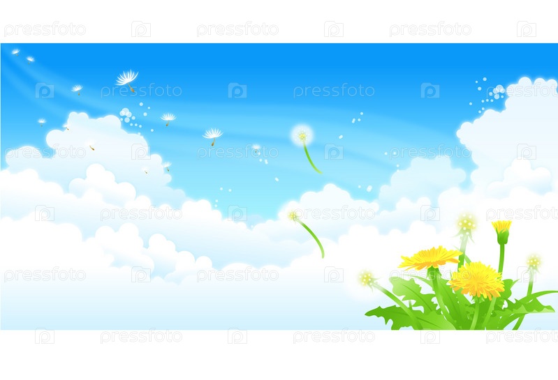 Голубое небо с облаками и цветущие одуванчики, иллюстрация