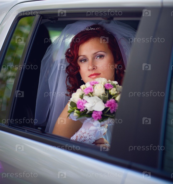 Счастливая невеста в свадебном автомобиле