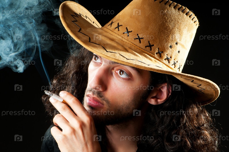 Мужчина с сигаретой в ковбойской шляпе на черном фоне