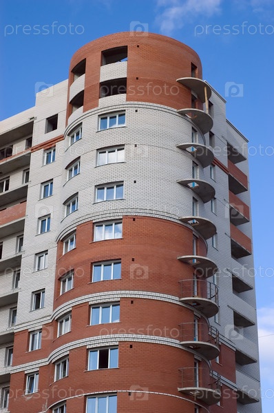 Высокий многоэтажный дом из красного и белого кирпича