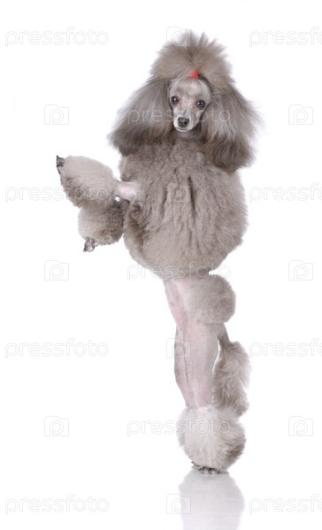 Серый пудель стоит на задних лапах на белом фоне