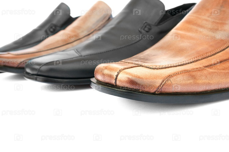 Коричневые и черные мужские туфли на белом фоне