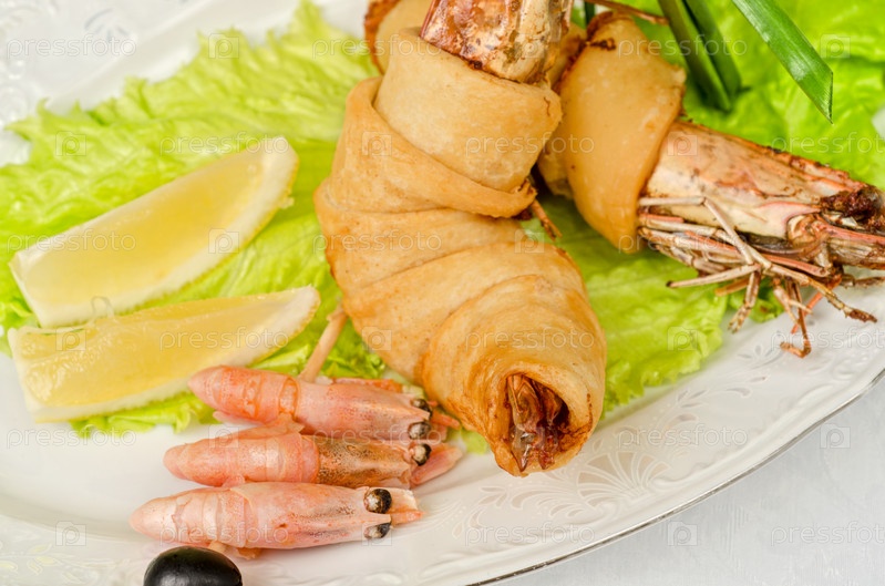 Креветки с листьями салата, зеленый лук, лимон и маслины