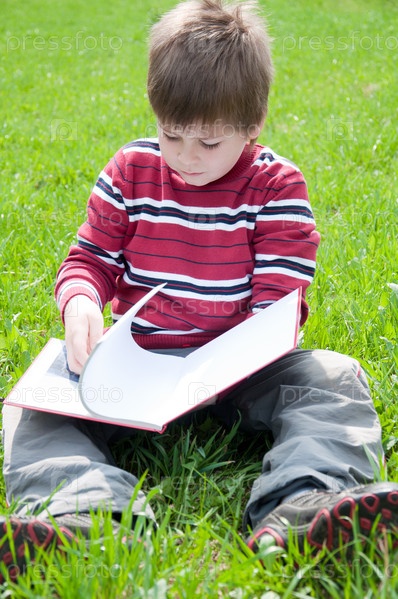 Мальчик читает книгу сидя на зеленой лужайке