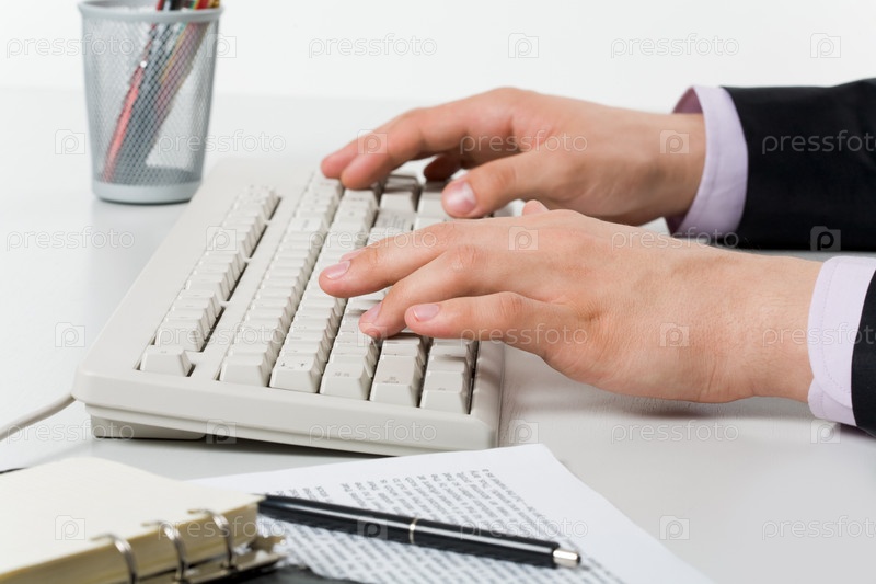 Близкий план мужских рук, нажимающих клавиши компьютерной доски на рабочем месте