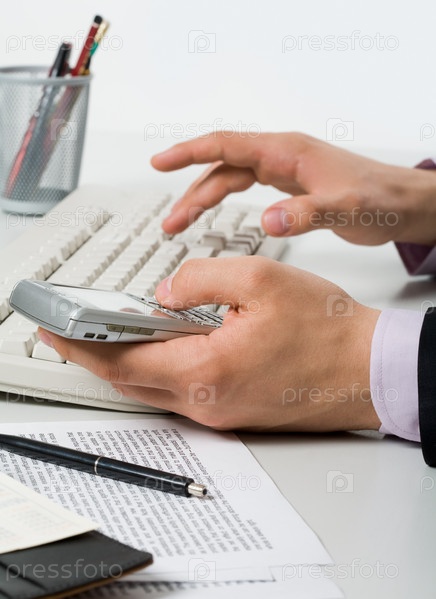 Близкий план мужской руки, нажимающей клавиши смартфона и толкающей кнопки клавиатуры