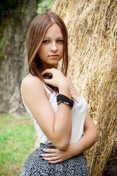 Красивая естественная девушка позирует на фоне сена