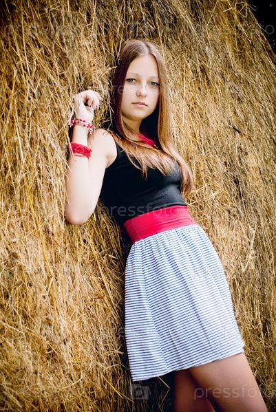 Красивая девушка позирует на фоне сена
