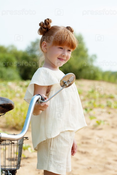 Рыжая девочка с велосипедом на пляже