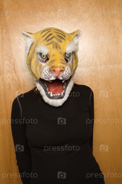 Женщина носит маску тигра