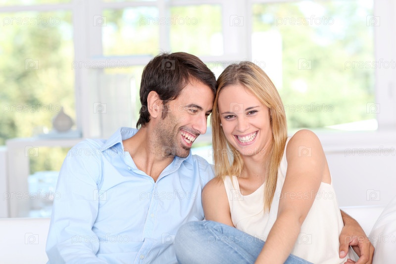 Молодая пара на диване у себя дома