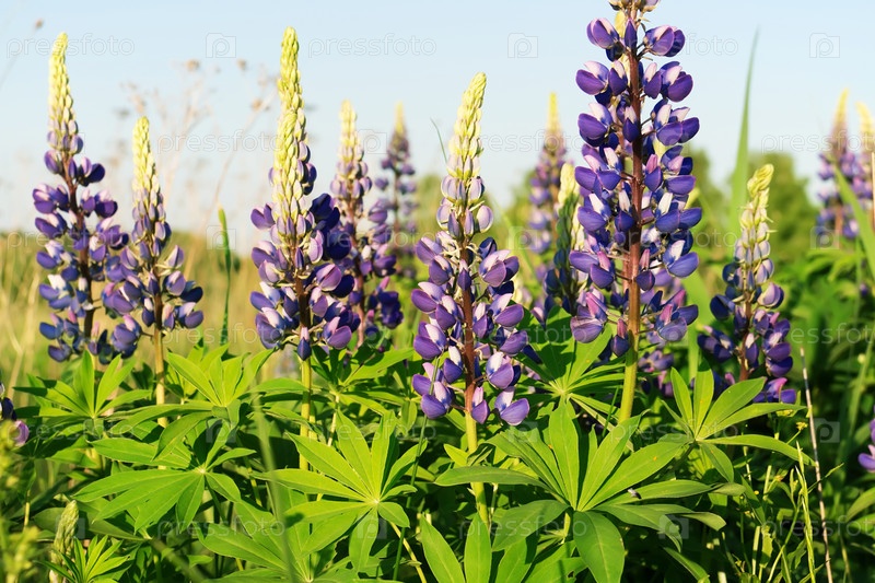 Сиреневые цветущие люпины на фоне неба