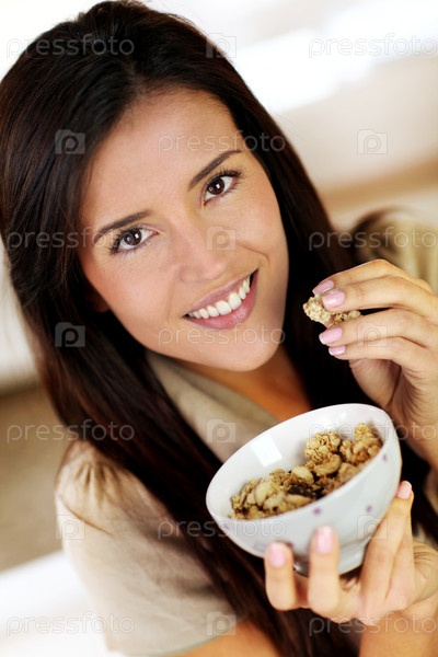 Красивая брюнетка ест каши по утрам
