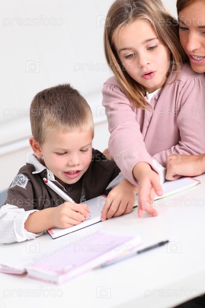 Женщина помогает детям с заданием