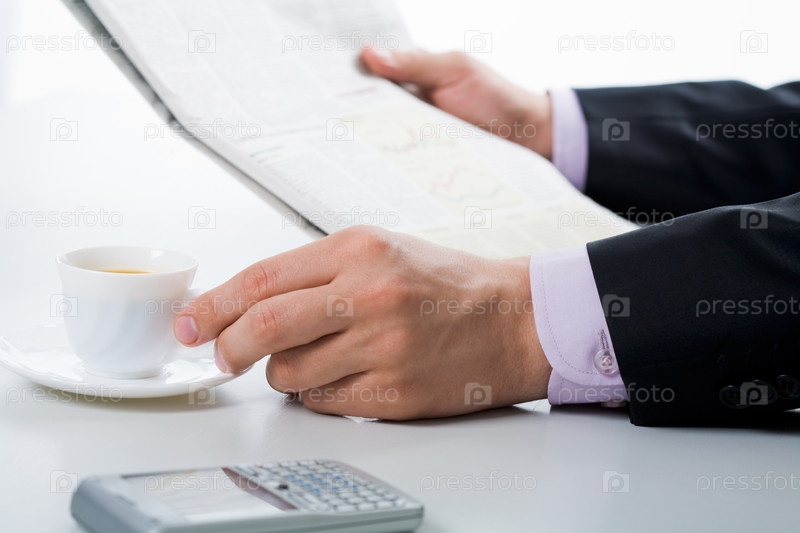 Близкий план мужской руки на чашке кофе во время чтения бумаги