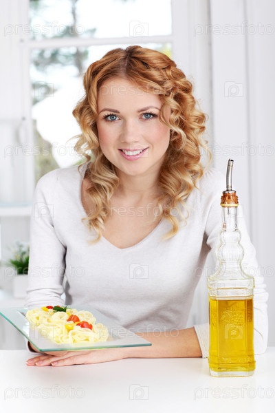Женщина, держащая тарелку макарон