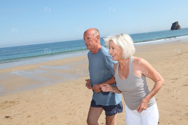 Пожилые супружеские пары бег на песчаном пляже