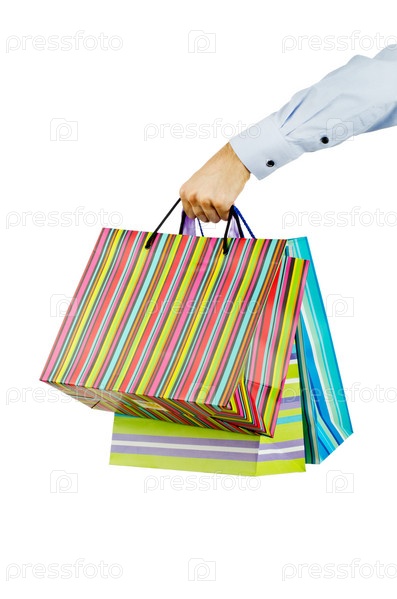 Бумажные пакеты в руке на белом фоне
