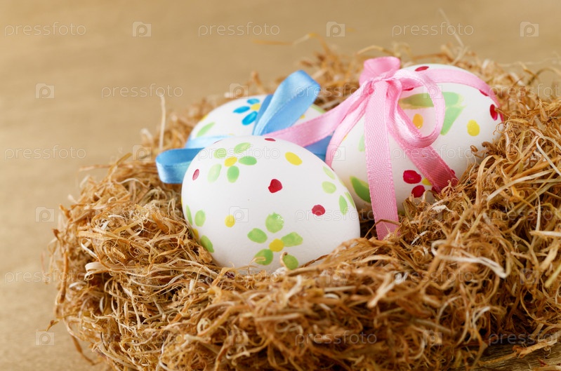 Пасхальные яйца с бантиками в гнезде