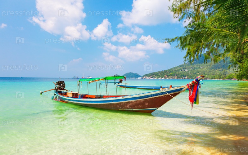 Длиннохвостый лодки и красивый пляж. Кох Тао, Таиланд