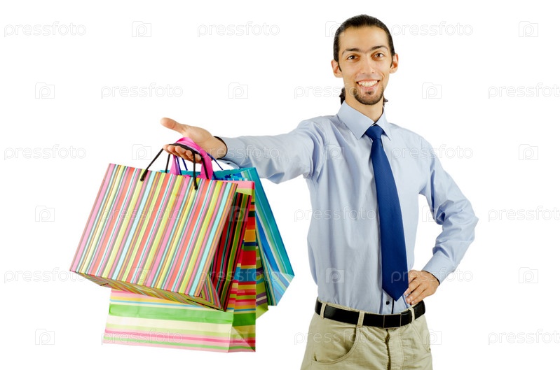Симпатичный молодой человек с бумажными пакетами изолирован на белом фоне