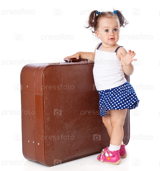 Маленькая девочка у чемодана. Изолирована на белом фоне